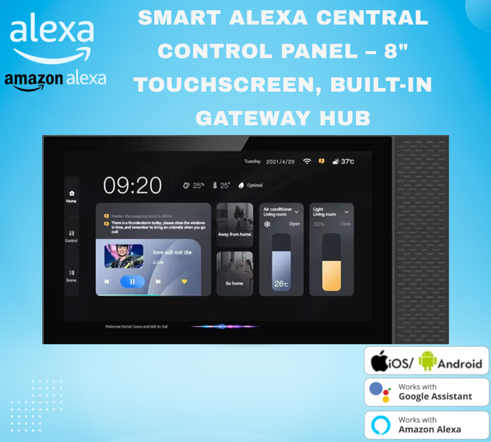 📊 8-Inch LCD Screen – Displays time, date, and weather dynamically, with one-touch access to favorite scenes and devices.