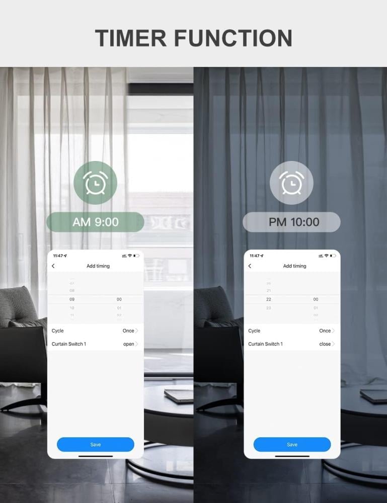 ✅ جدولة ذكية للتشغيل والإيقاف التلقائي ⏰ (مثال: فتح الستائر الساعة 6 صباحاً وإغلاقها الساعة 7 مساءً)