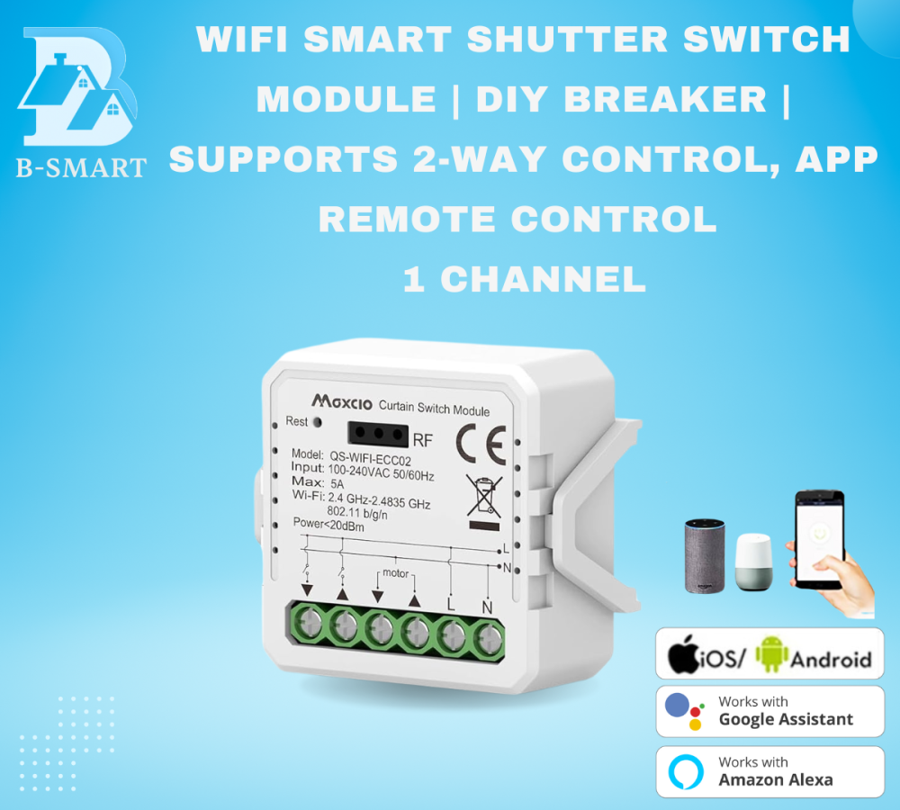 🔹 Smart switch designed to remotely control curtain shutters and garage doors via Wi-Fi — allowing you to open or close them securely from anywhere.